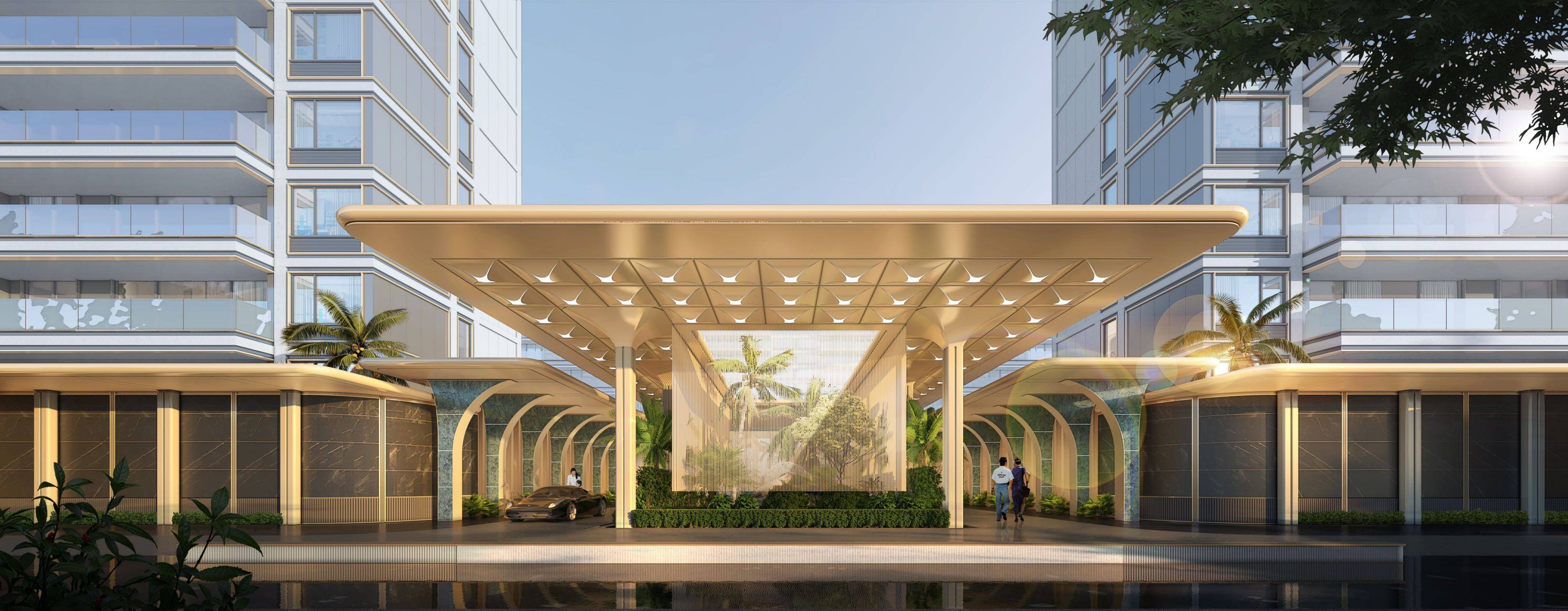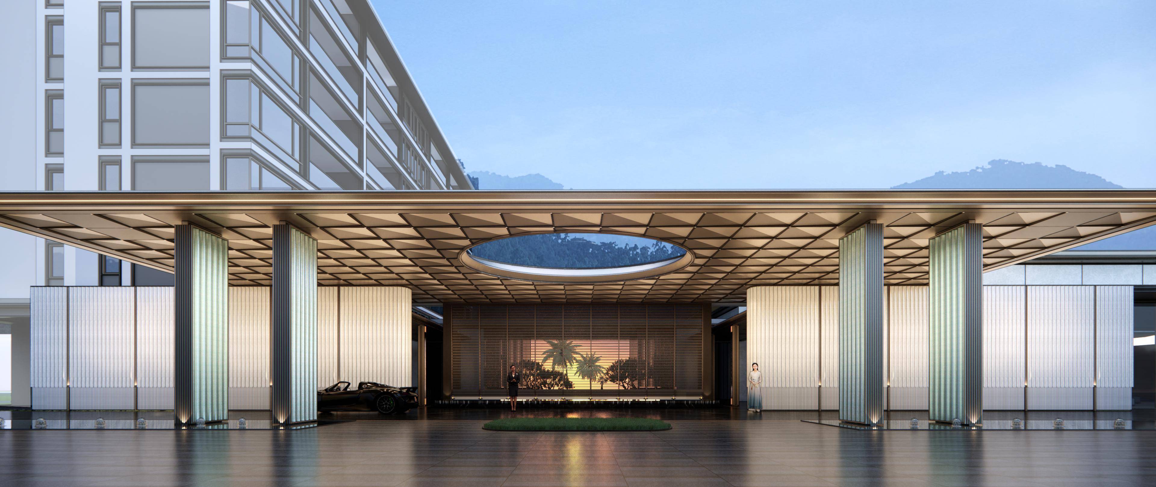 入口以浅色格莉莎石材墙面为底色,犹如富有肌理的长卷,徐徐引入归心之所;气势恢宏的琉璃金色“龙鳞”华顶,尽显威仪,“星空顶”下,尺度恰如其分,带来自然与自在观感。用严苛品质征服挑剔的感官,礼序加冕、格调美学,亦是对未来生活方式的引领。